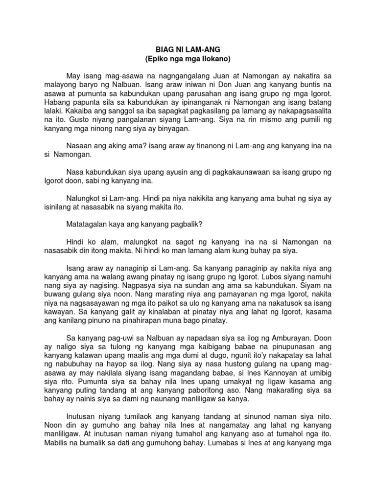 Ng epiko ni biag ni lam-ang ifugao alim ifugao hudhud ni kwentong epiko ng ibalon bantug sang buong epikong pilipino ano ang buod. Nilusob ng mga Igorot ang tribo ni Don Juan na naging sanhi ng pagkamatay ng kanyang pangkat. When his father disappeared for a long time then he decided to look for him.